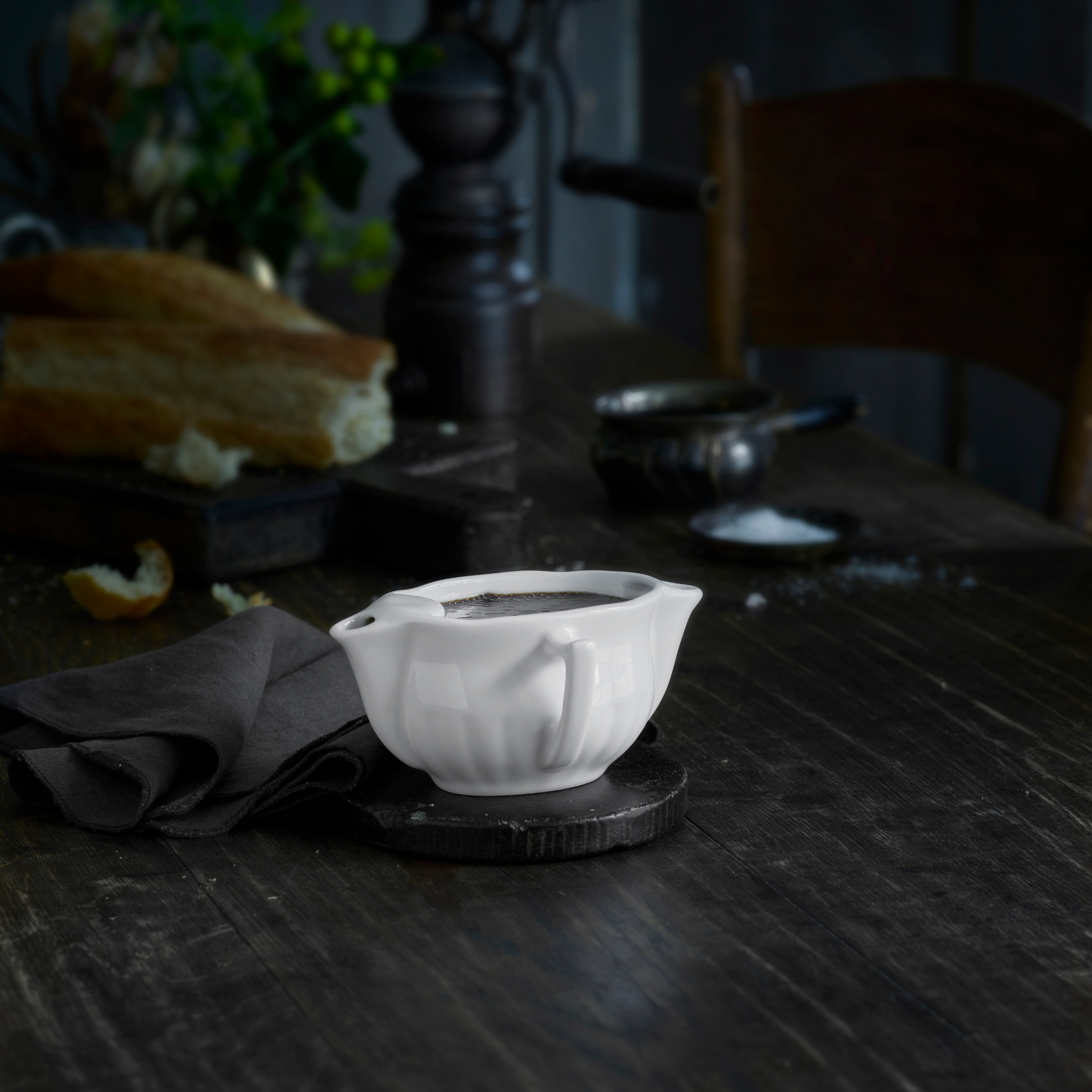 This clever porcelain piece allows you to pour the lean off the bottom and the fat off the top of broths and gravies Expertly crafted for durability and refined everyday use.