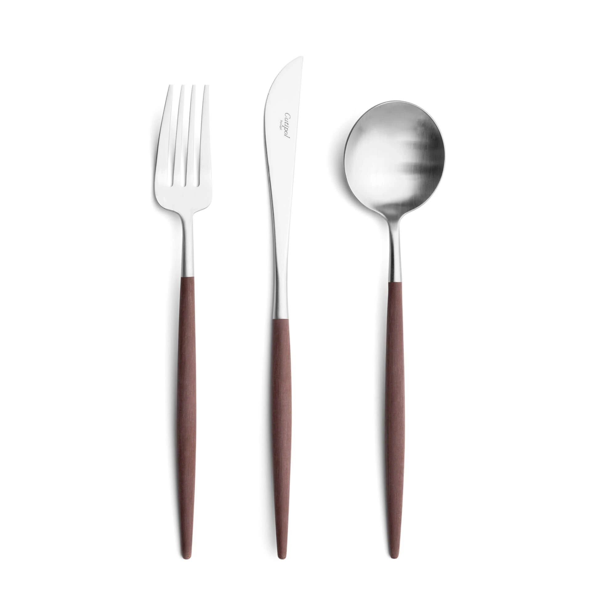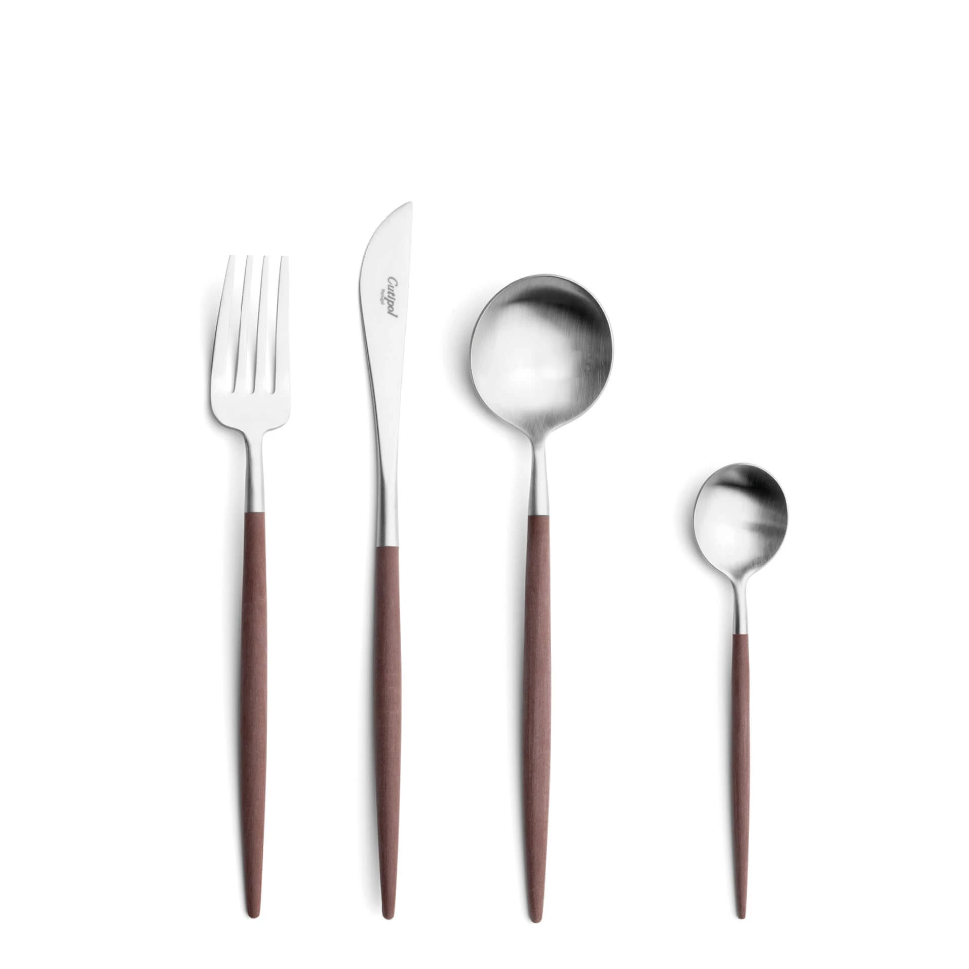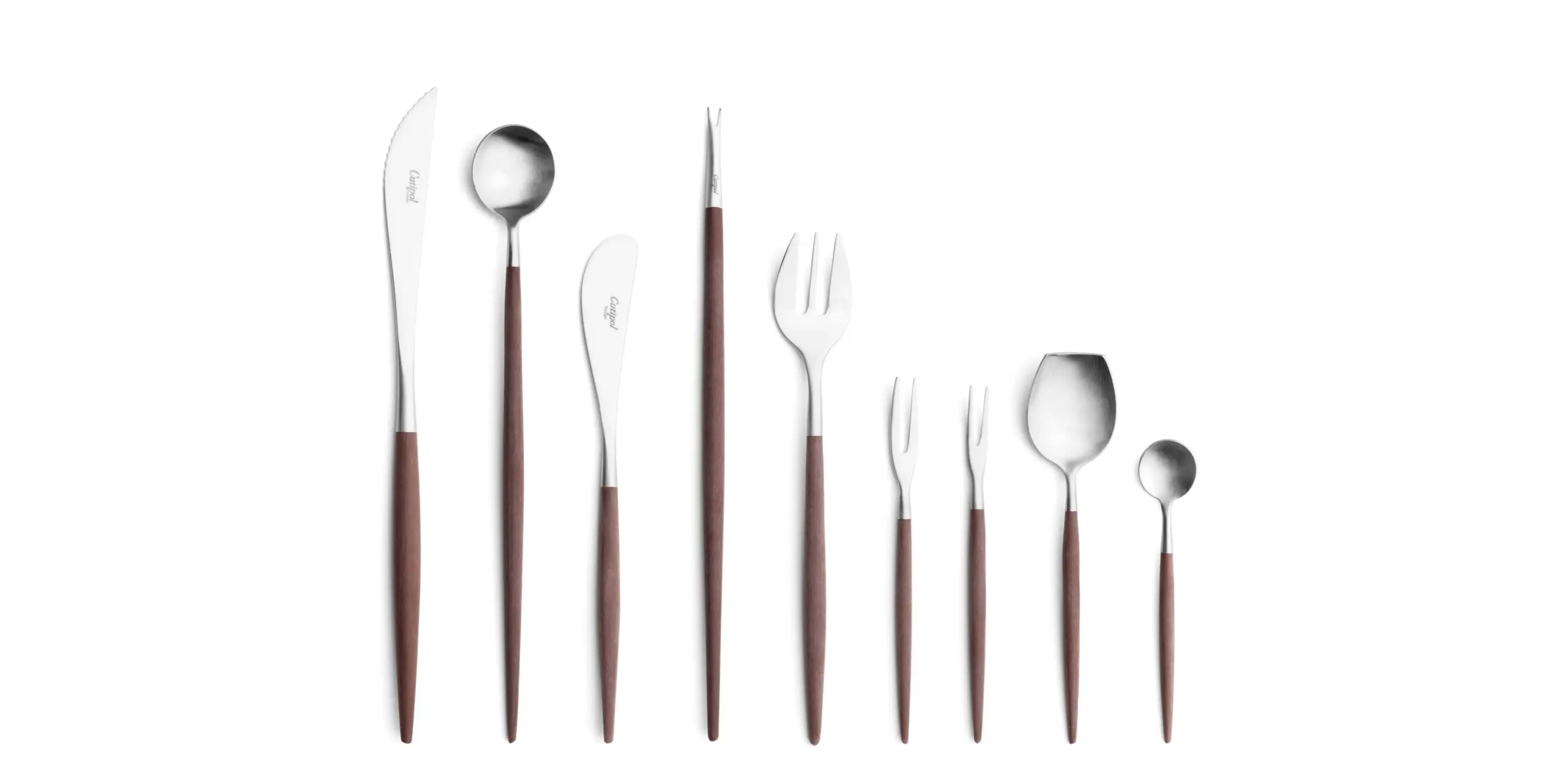 The tapered resin handle leads the hand; the steel head does the work. Robust selection from dinner to dessert and specialty pieces.