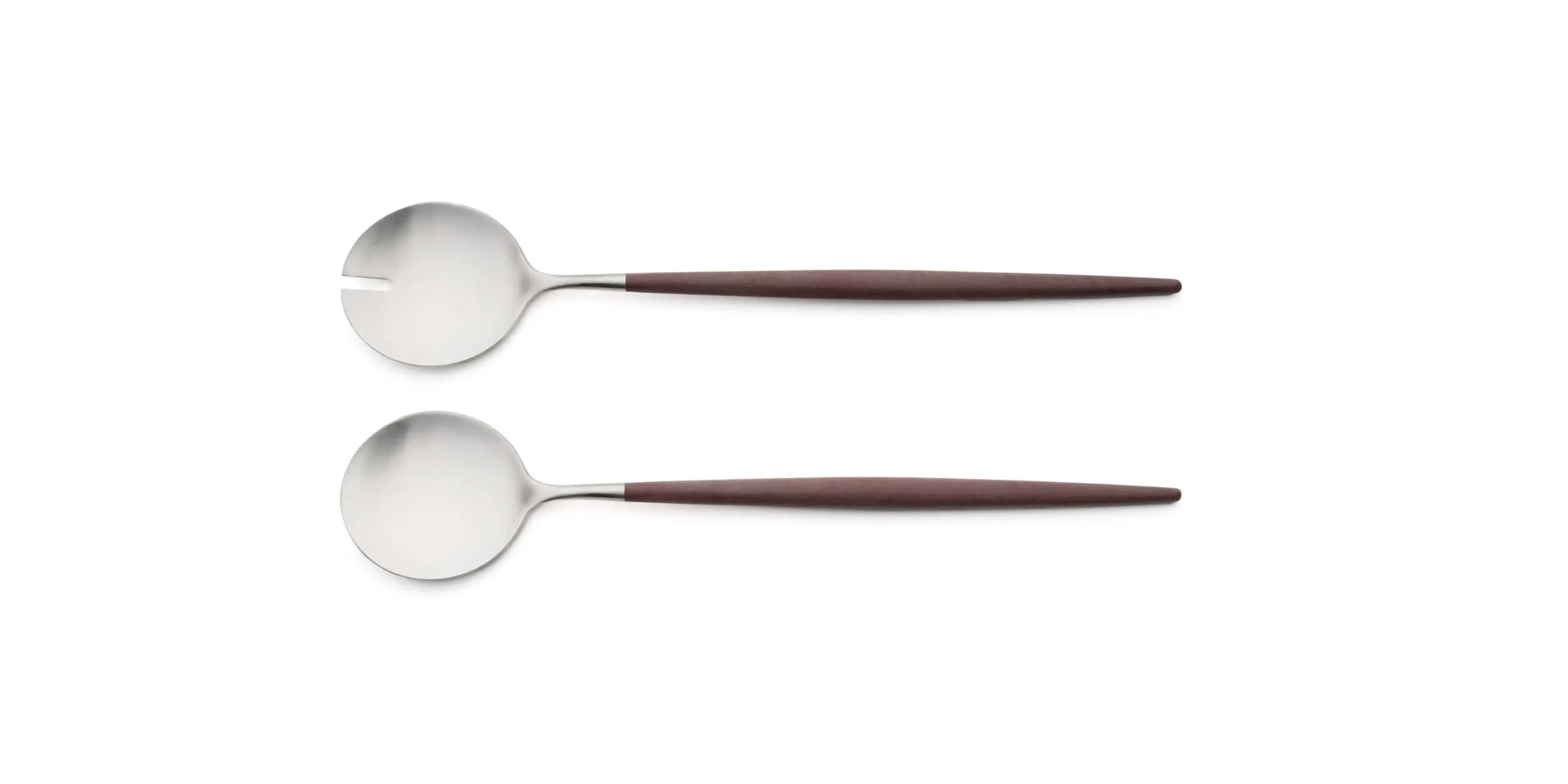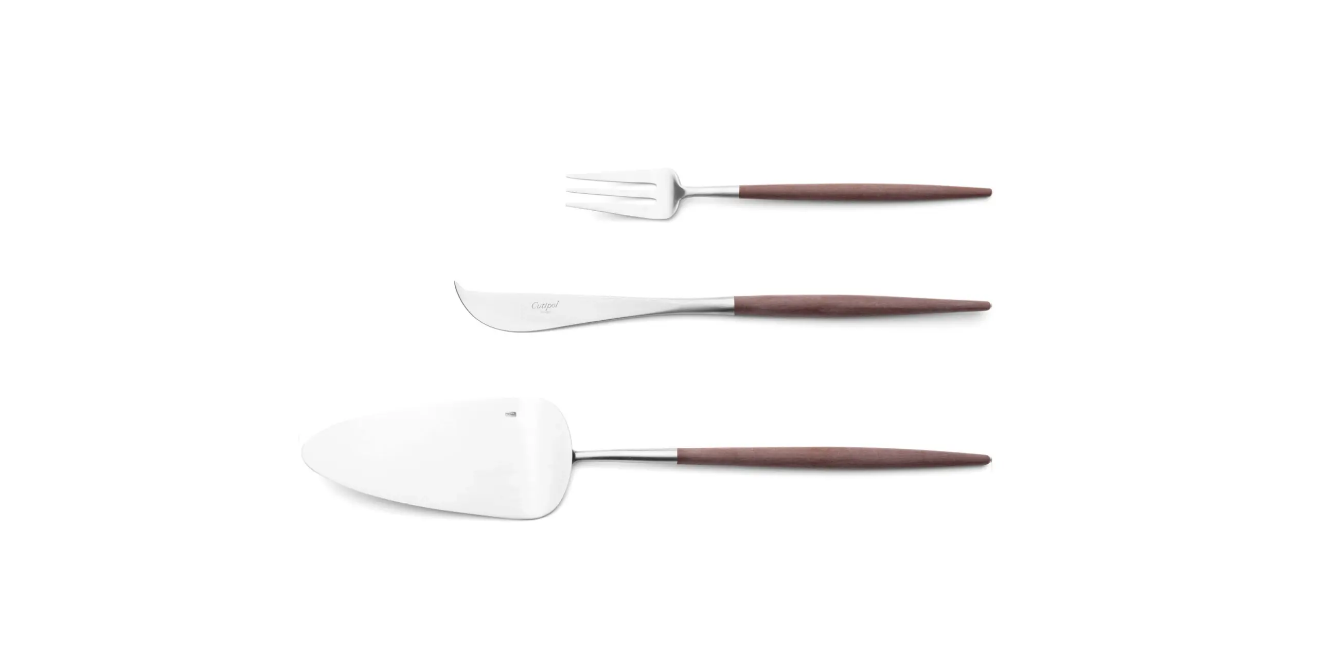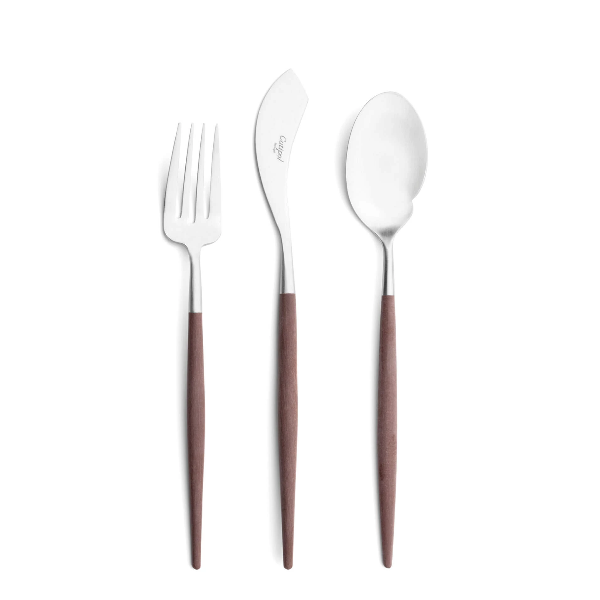 The tapered resin handle leads the hand; the steel head does the work. Robust selection from dinner to dessert and specialty pieces.