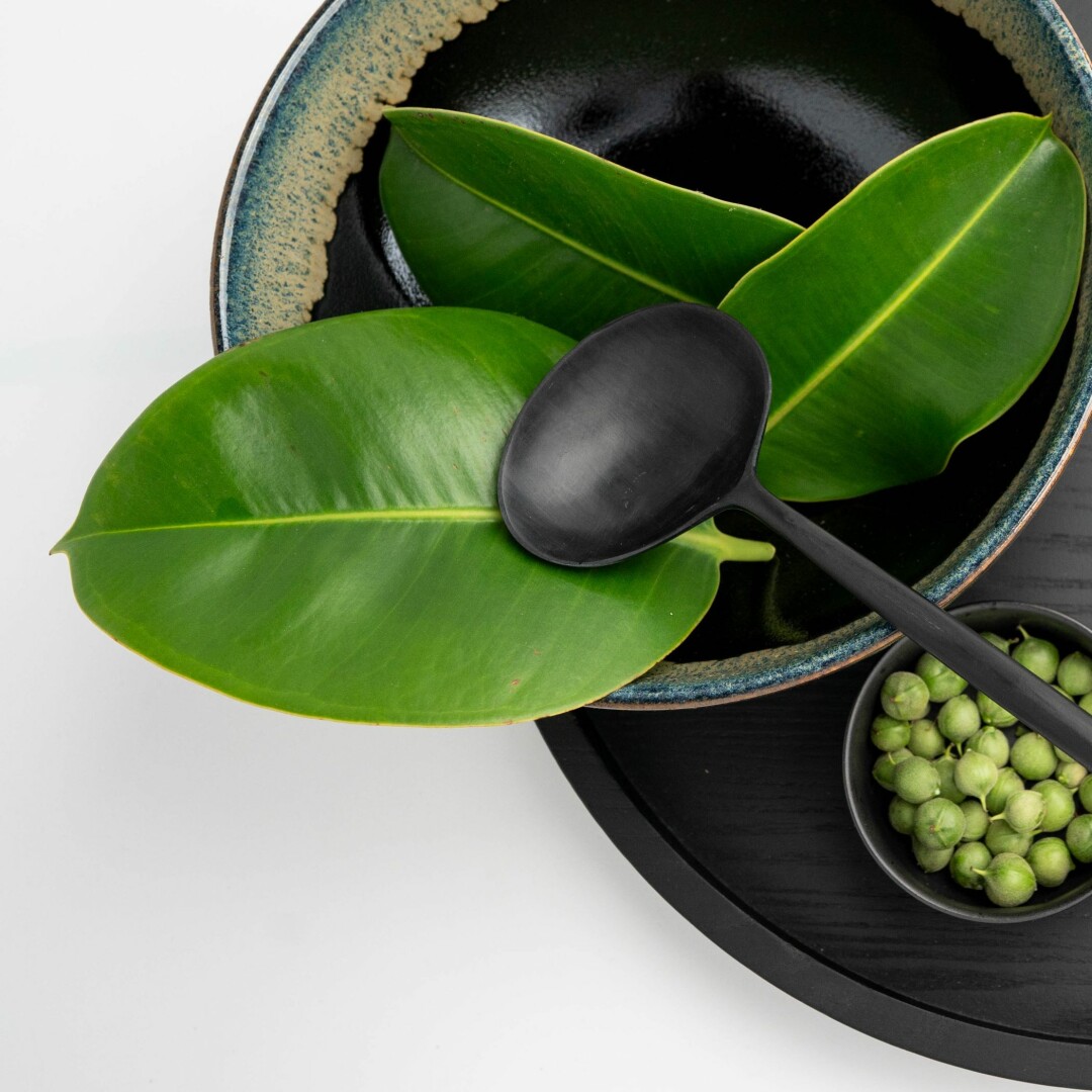 Black matte horn soup spoon with a minimalist profile that enhances comfort and control for soups and broths.