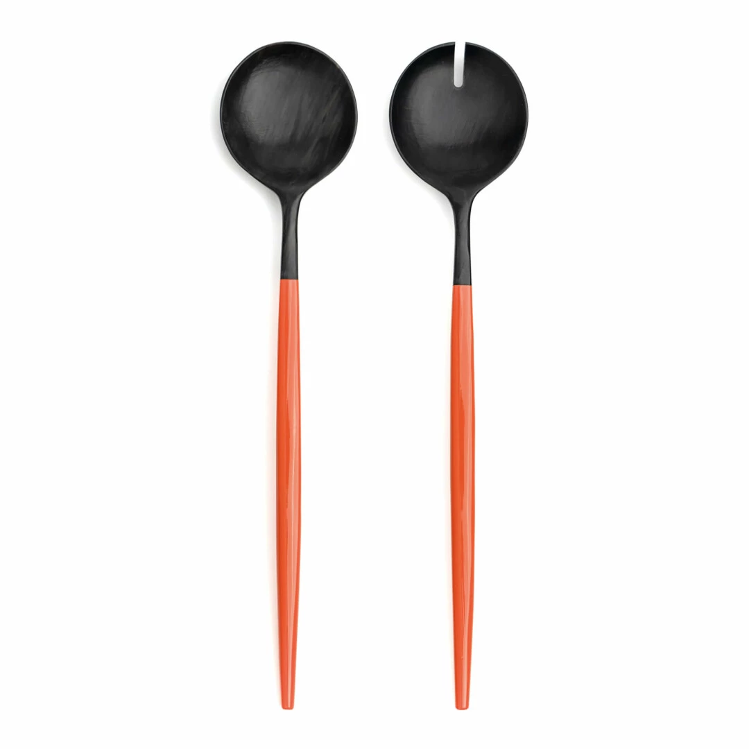 Two-piece set balances gentle tossing with precise plating for greens and composed salads.Matte horn surfaces protect delicate leaves while the orange lacquer adds a modern, graphic note.Comfortable handles improve control from bowl to plate.Each set showcases natural horn variations for a unique look.
