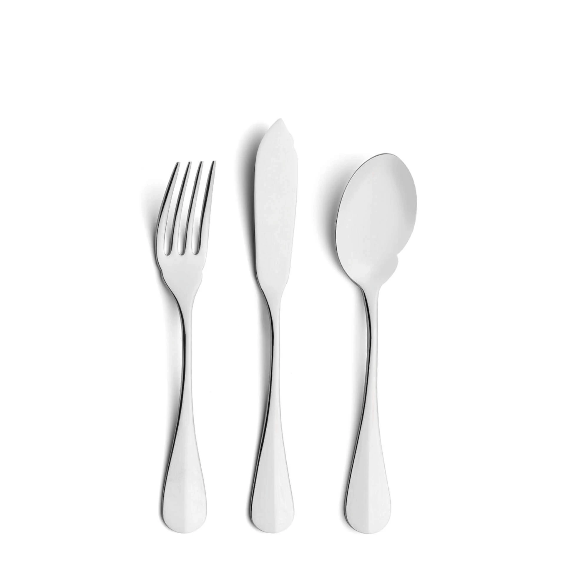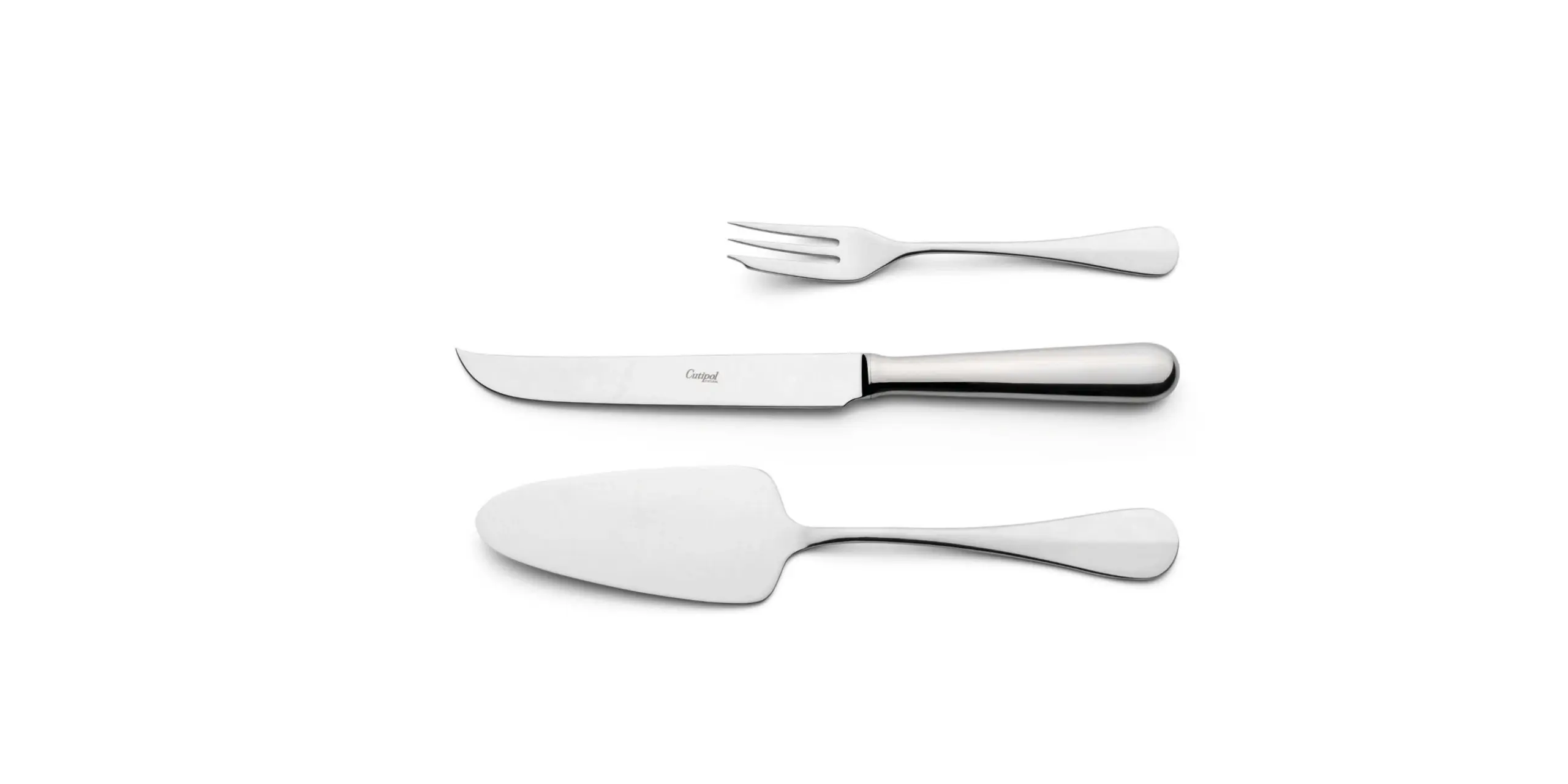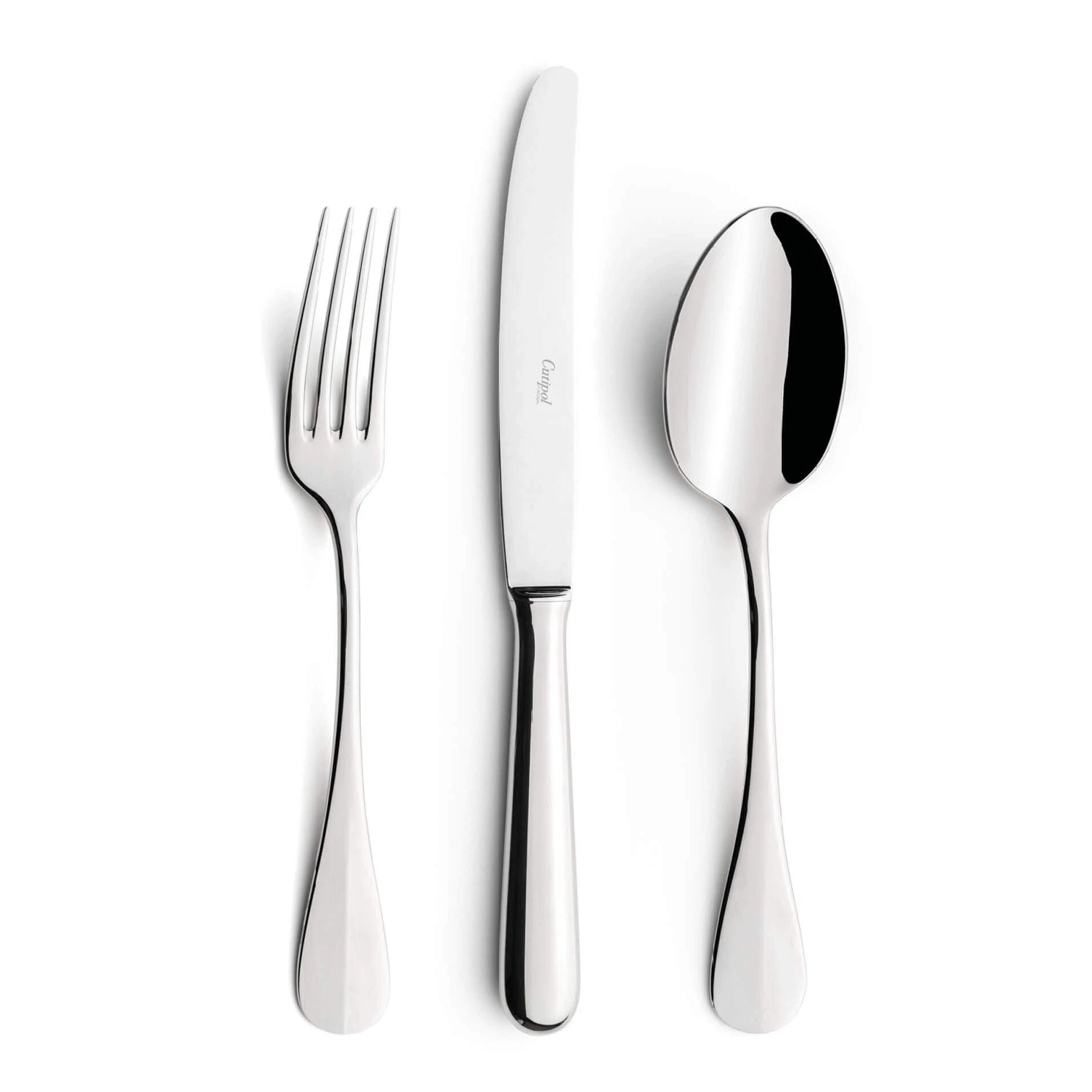 Baguette highlights a graceful midline and drop-shaped ends, paired with European-style hollow-handle knives for lighter, balanced service.