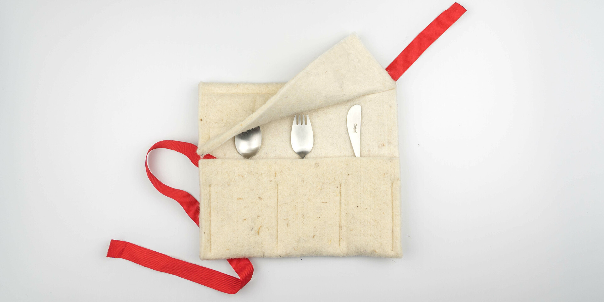 The Alice set encourages proper utensil use with curved, resin-clad handles and a portable wool case?perfect for home and on-the-go meals.