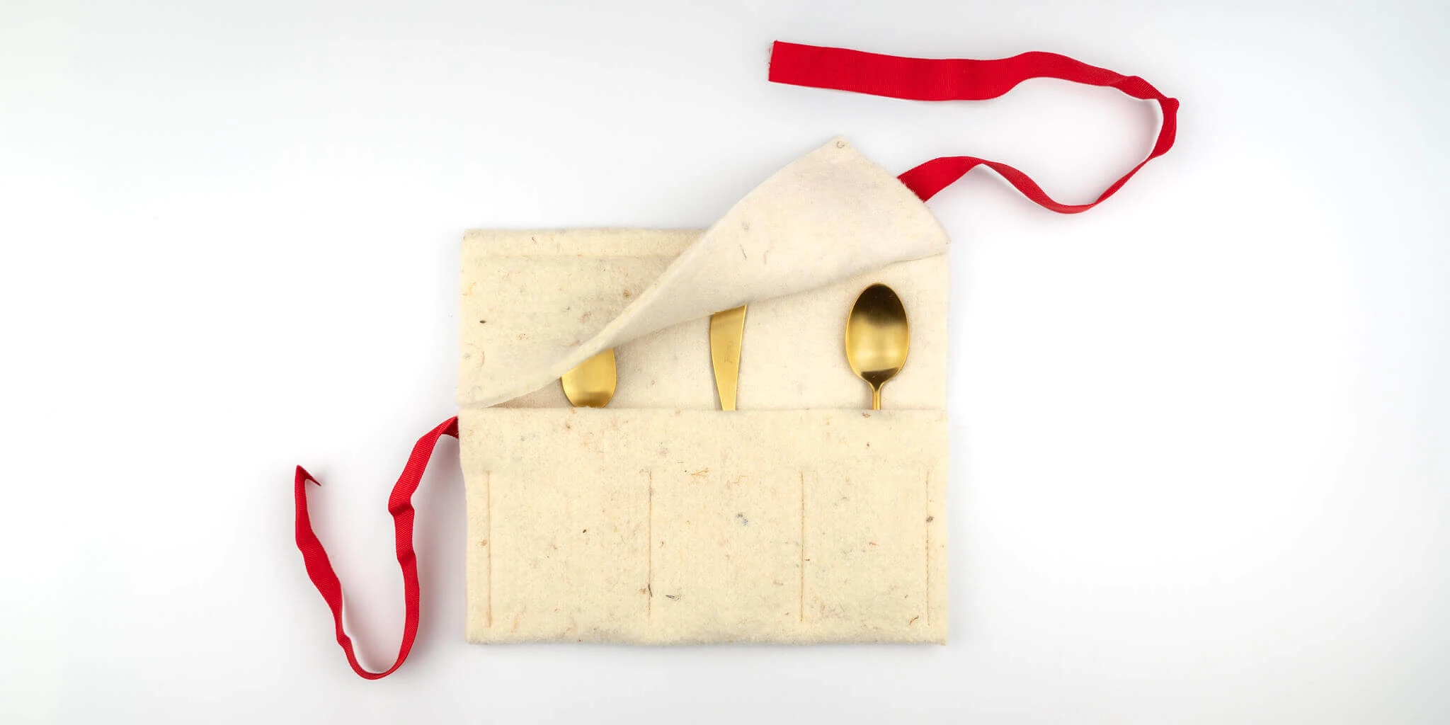 Knife, fork, spoon + wool case; stainless with contoured resin handles.