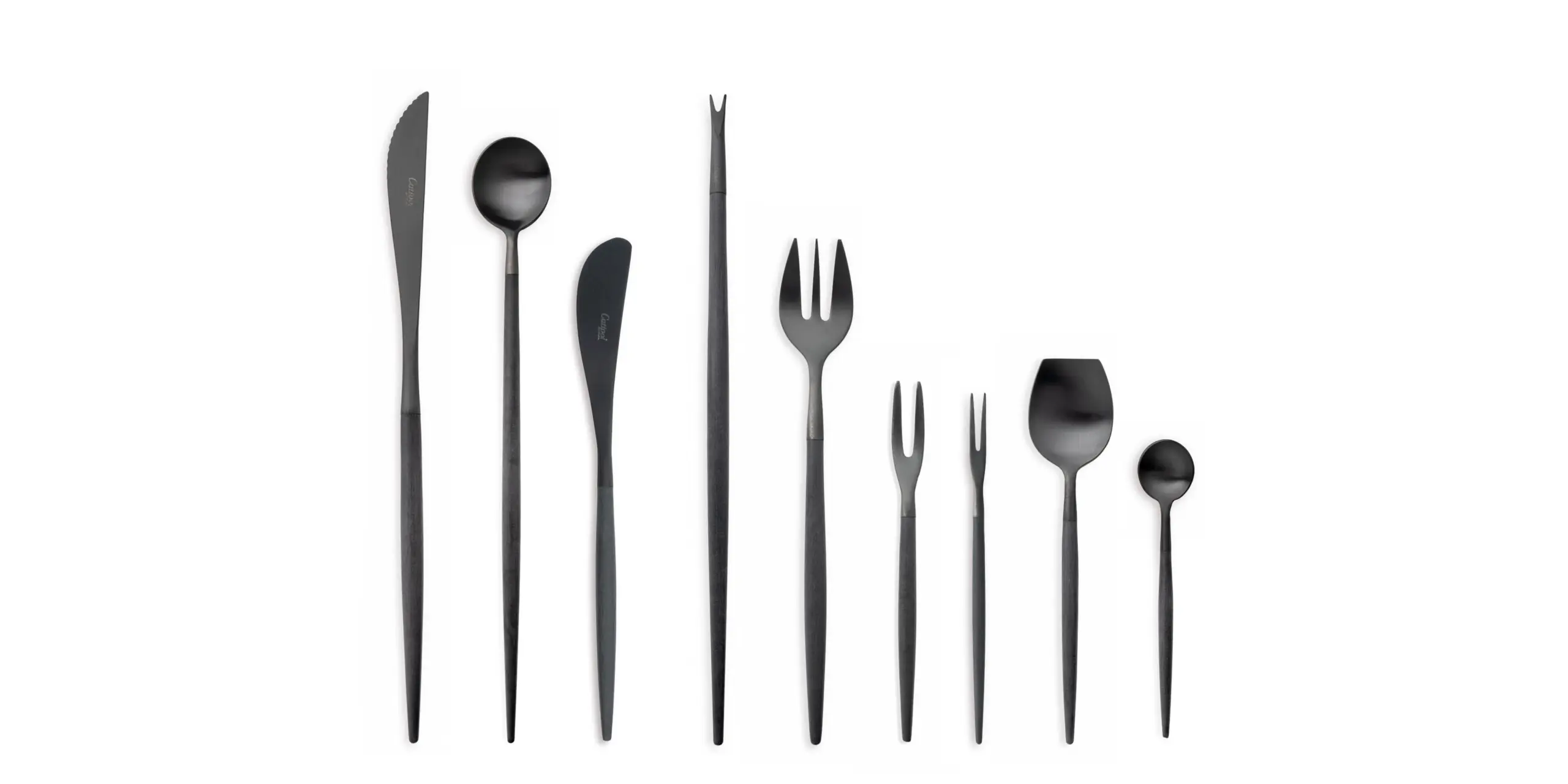 A house icon, Goa balances modern steel heads with resilient resin handles for a naturally ergonomic grip. The collection spans everything from dinner and fish courses to coffee, serving, salad, and gourmet pieces, including chopsticks with rest.
