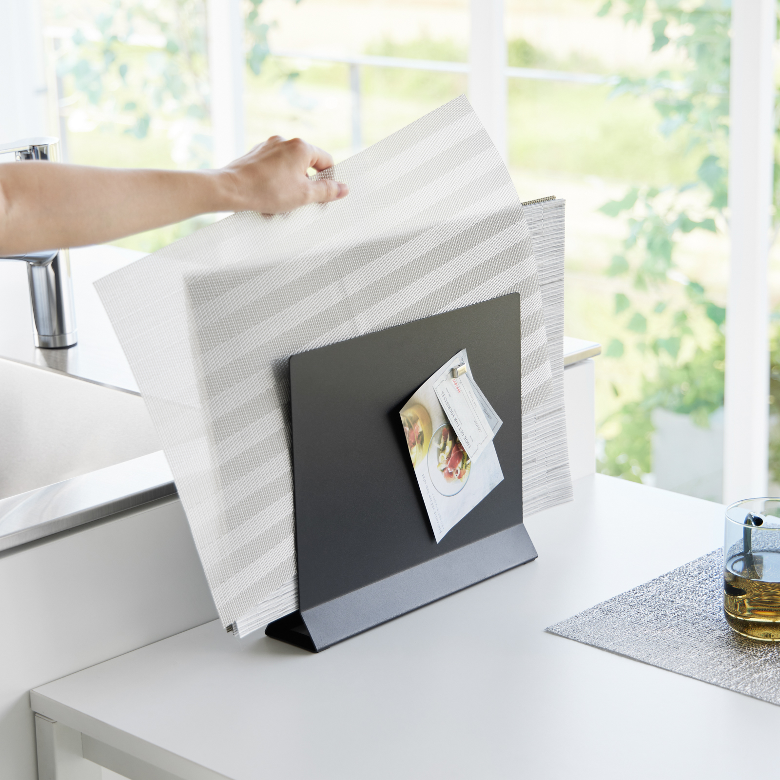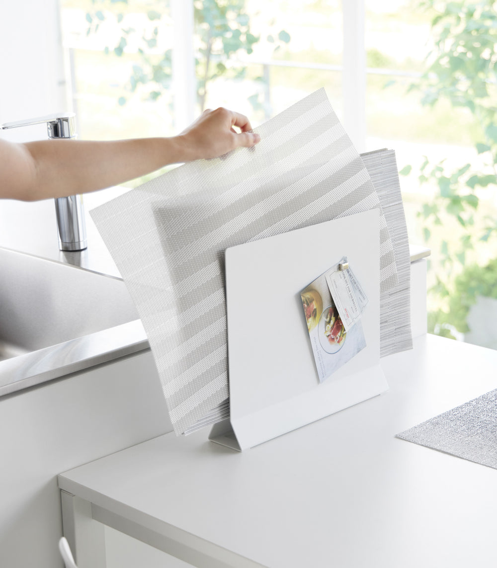 The Placemat Stand – Steel is a smart way to store flat items like placemats and trays. Its vertical, floating design keeps items lifted off surfaces for improved hygiene. Just 2.6″ wide, it saves counter space while keeping dining essentials organized and accessible. Built with durable steel and a BPA-free finish, it?s perfect for families, entertainers, or daily dining.